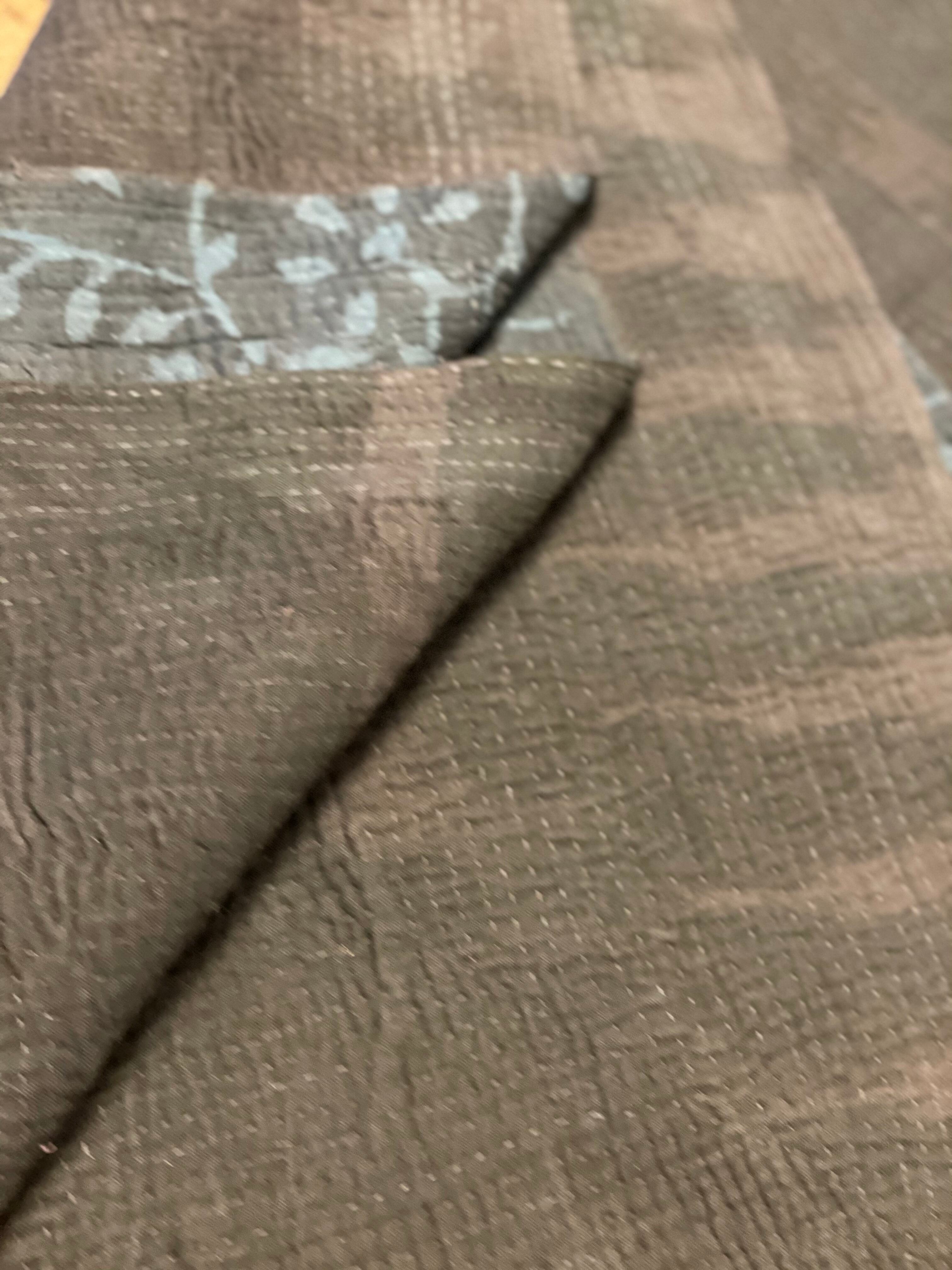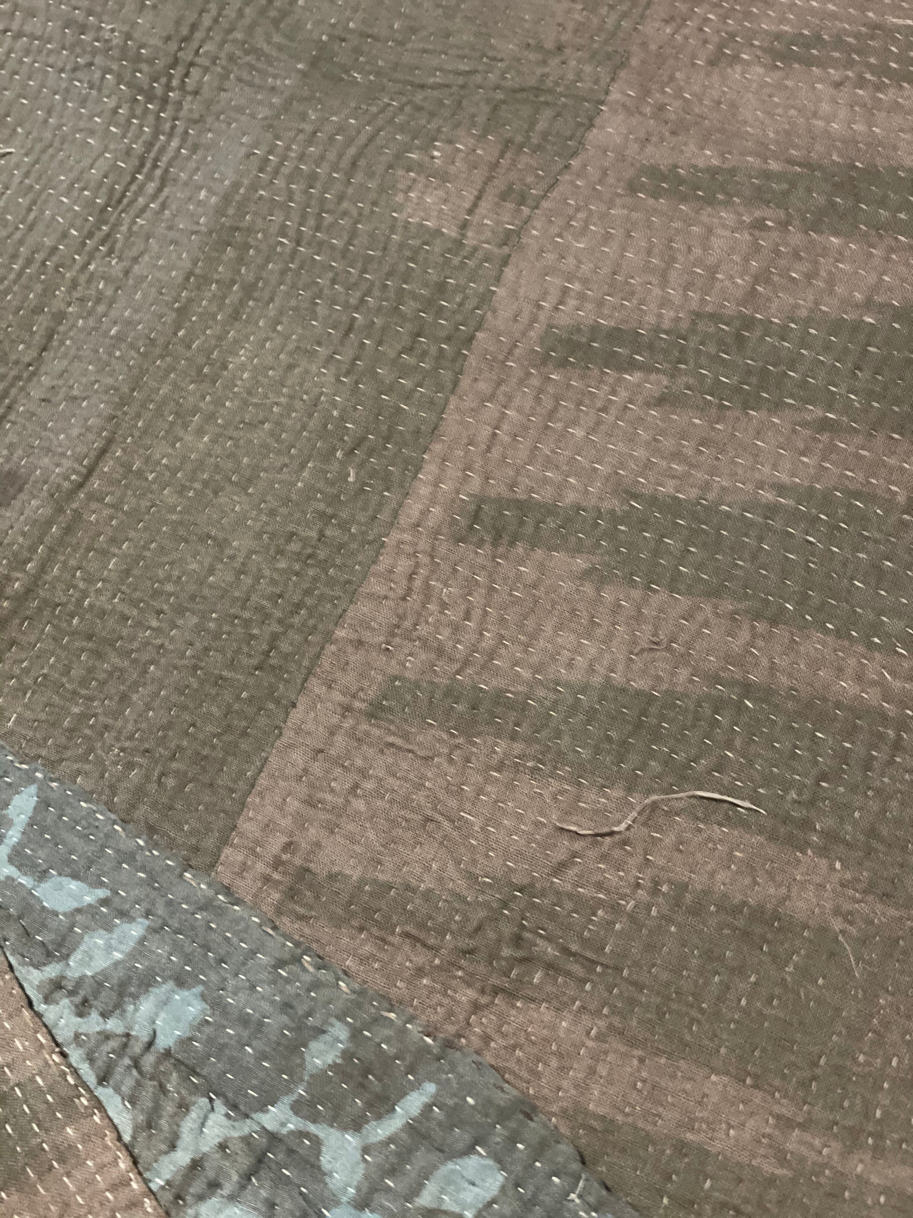 時を重ねてきた布々が 一枚の布に縫い合わさりさらにひと針ひと針刺し縫われて様々な表情を見せるファブリックはインドのインドのコルカタからバングラデシュの伝統刺し子民芸品です。