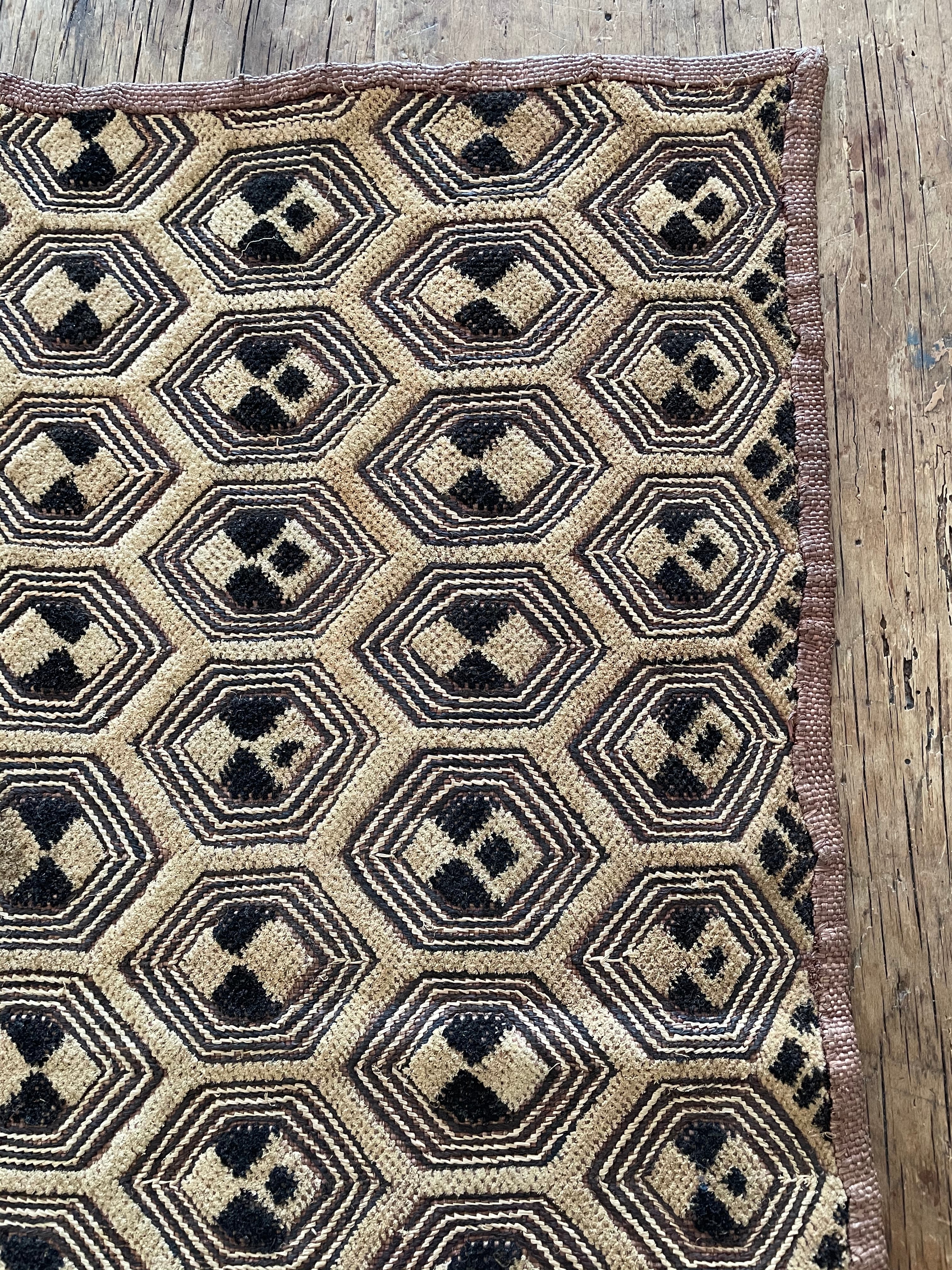 ラフィアの平織りの布に単純な刺繍とランバットとよばれる糸の束を突起させ、