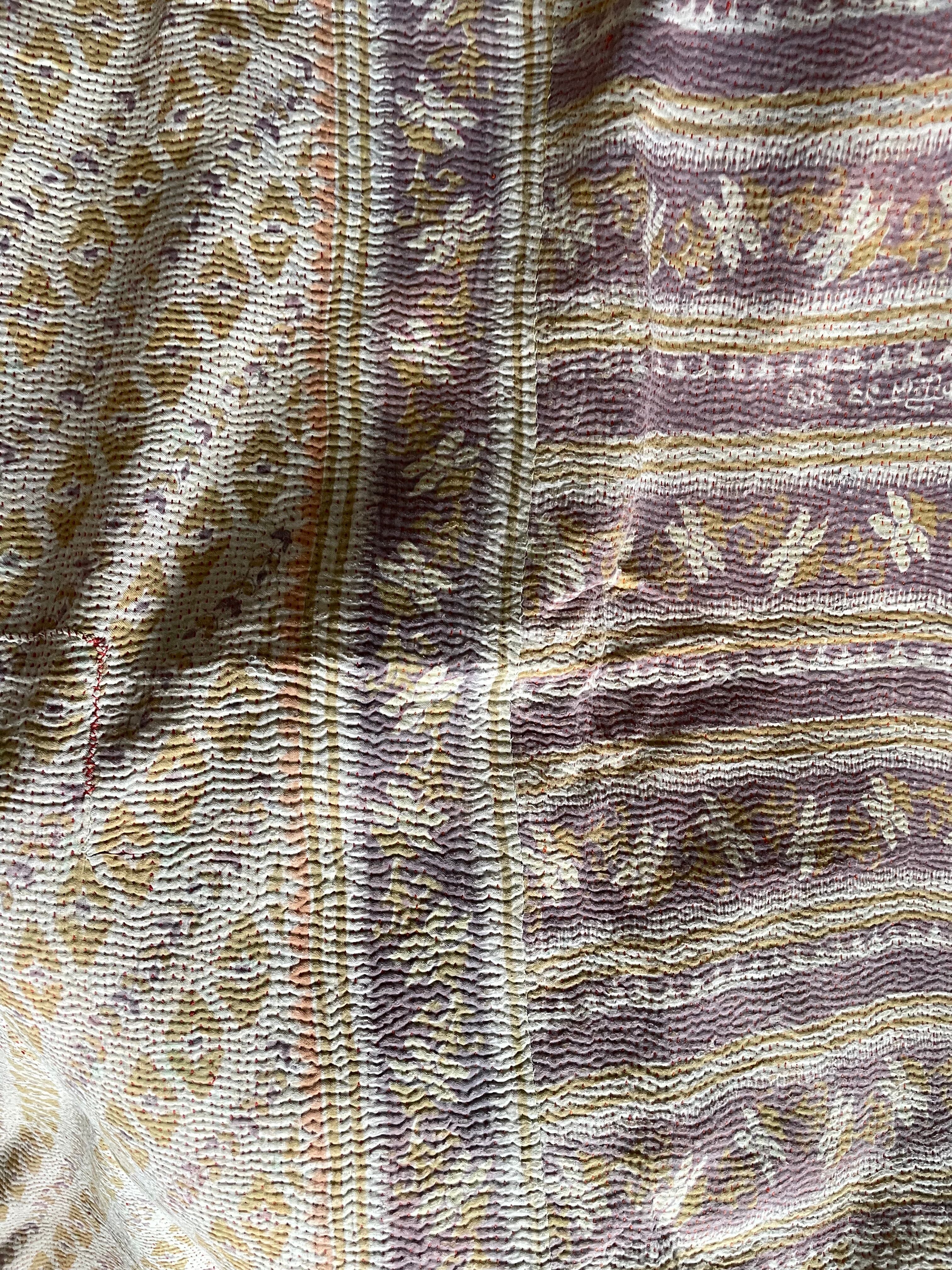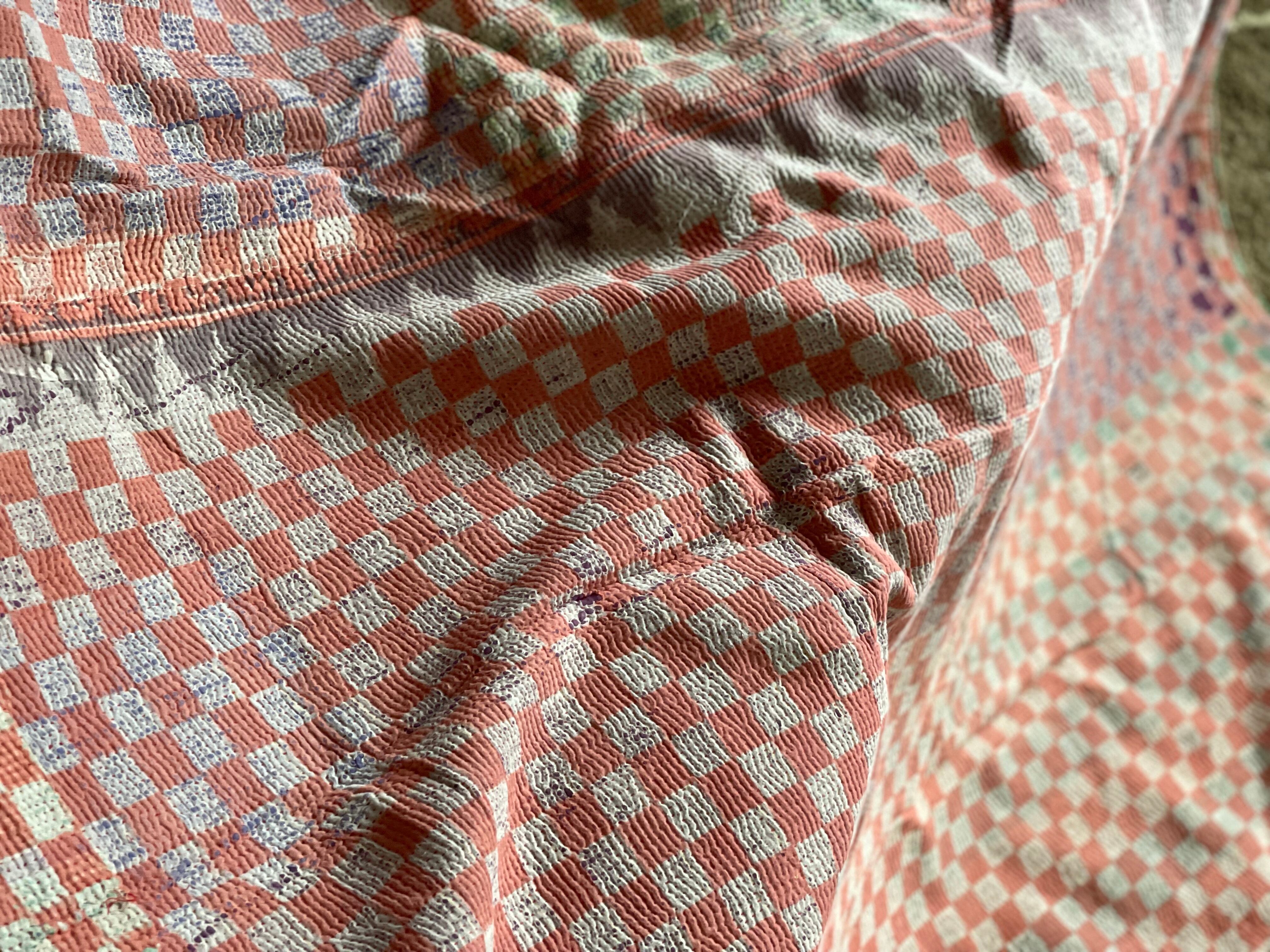 様々な色が混ざり合い、畳むと全て違う表情を見せるカンタ。ステッチや柔らかでクタッとしたコットンやビンテージサリーを細かくひと針ひと針、人の手によって刺し縫われ30〜50着をつないで作るビンテージカンタ。
