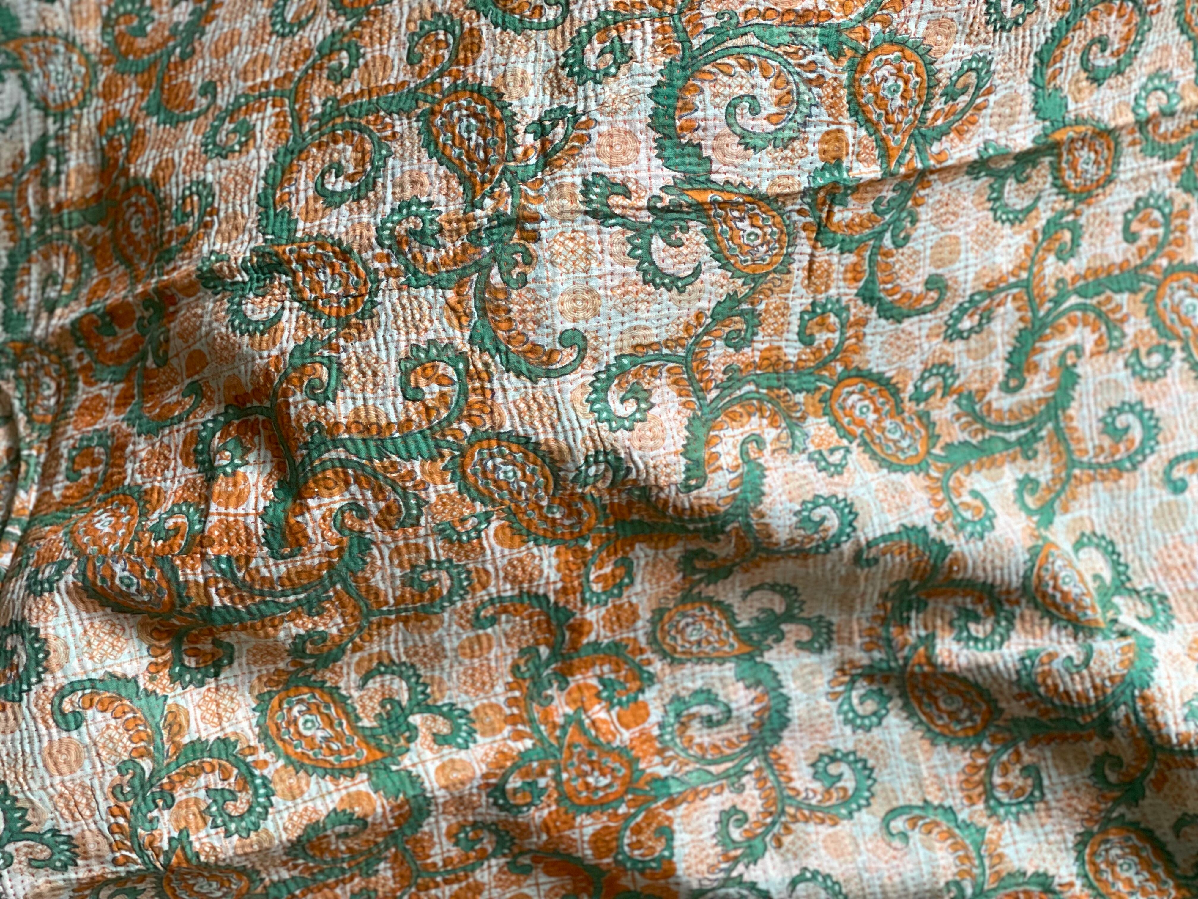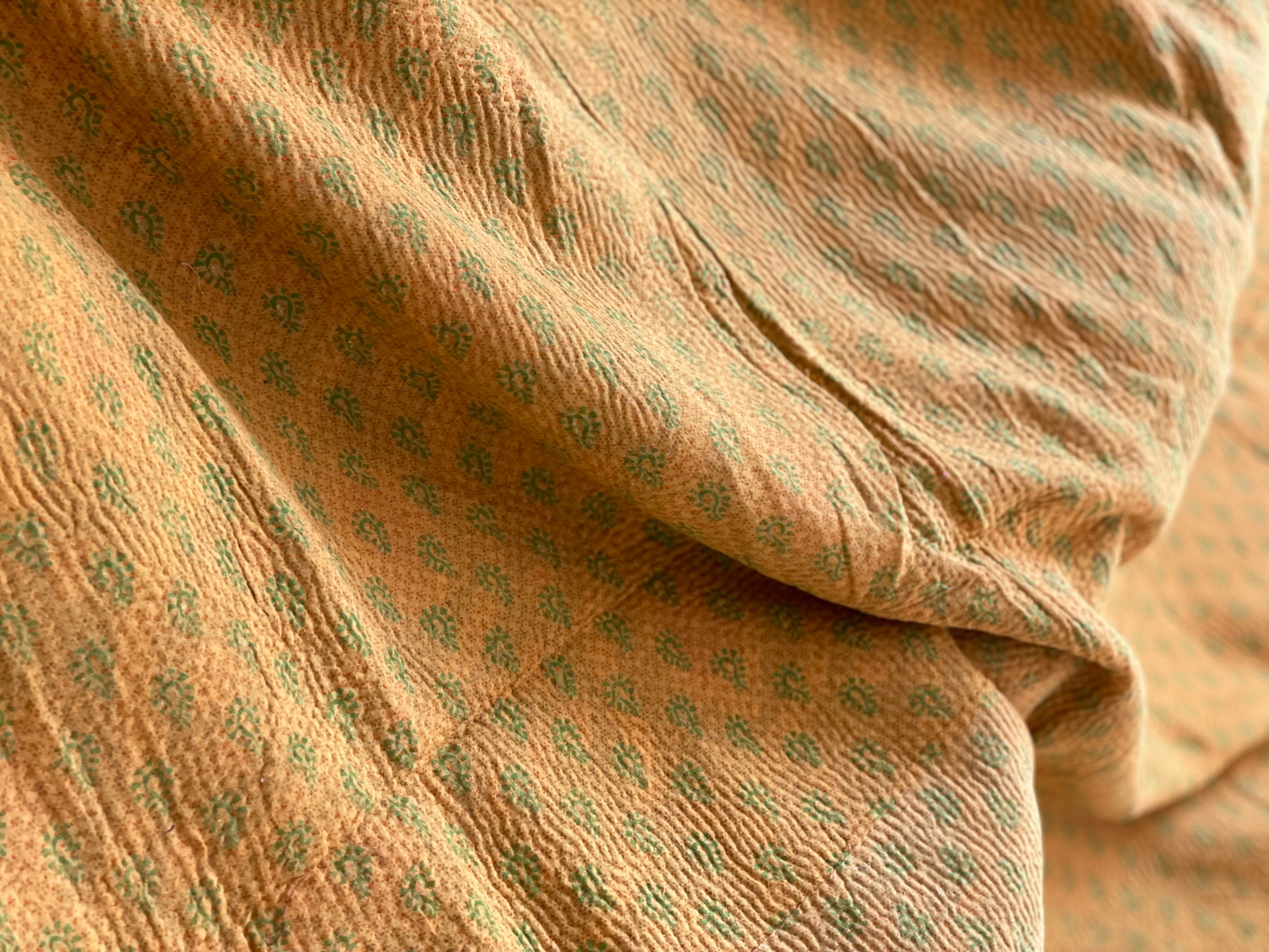 様々な色が混ざり合い、畳むと全て違う表情を見せるカンタ。ステッチや柔らかでクタッとしたコットンやビンテージサリーを細かくひと針ひと針、人の手によって刺し縫われ30〜50着をつないで作るビンテージカンタ。
