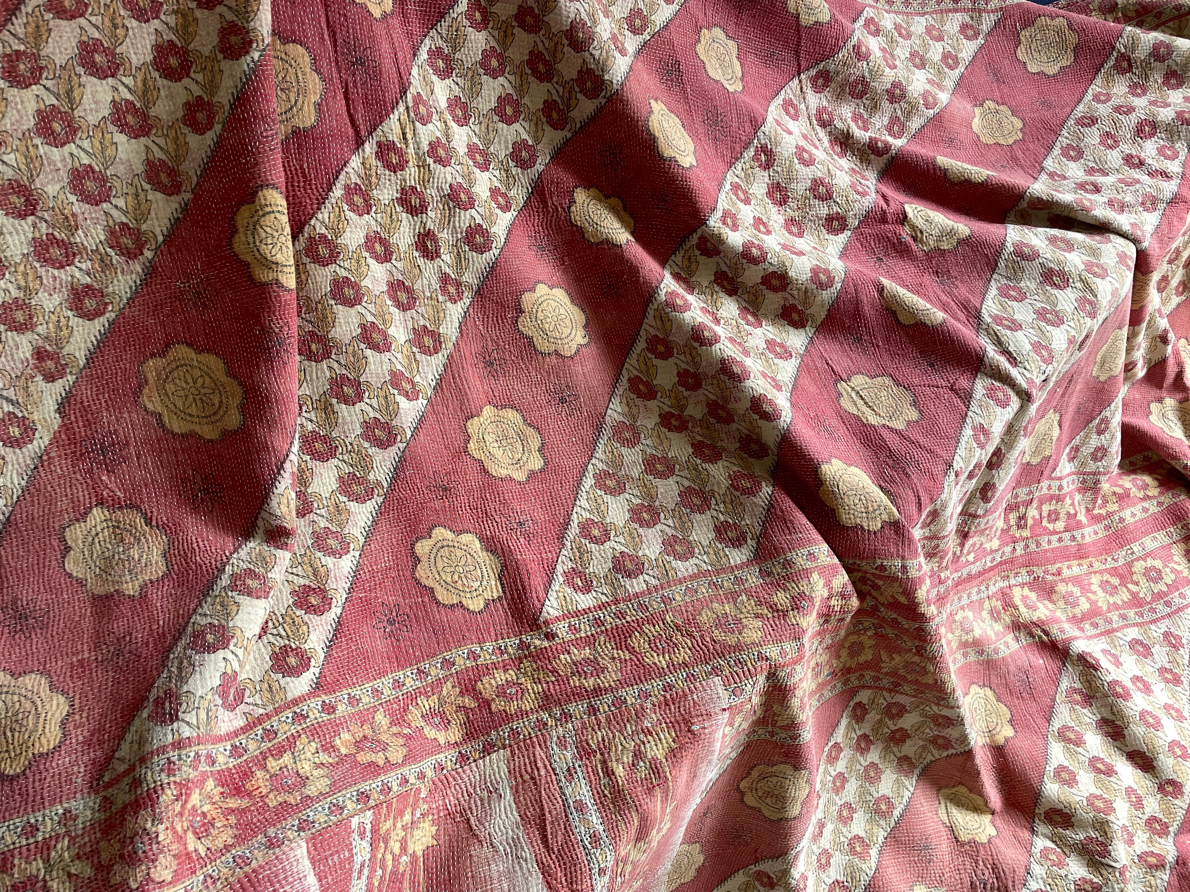 様々な色が混ざり合い、畳むと全て違う表情を見せるカンタ。ステッチや柔らかでクタッとしたコットンやビンテージサリーを細かくひと針ひと針、人の手によって刺し縫われ30〜50着をつないで作るビンテージカンタ。
