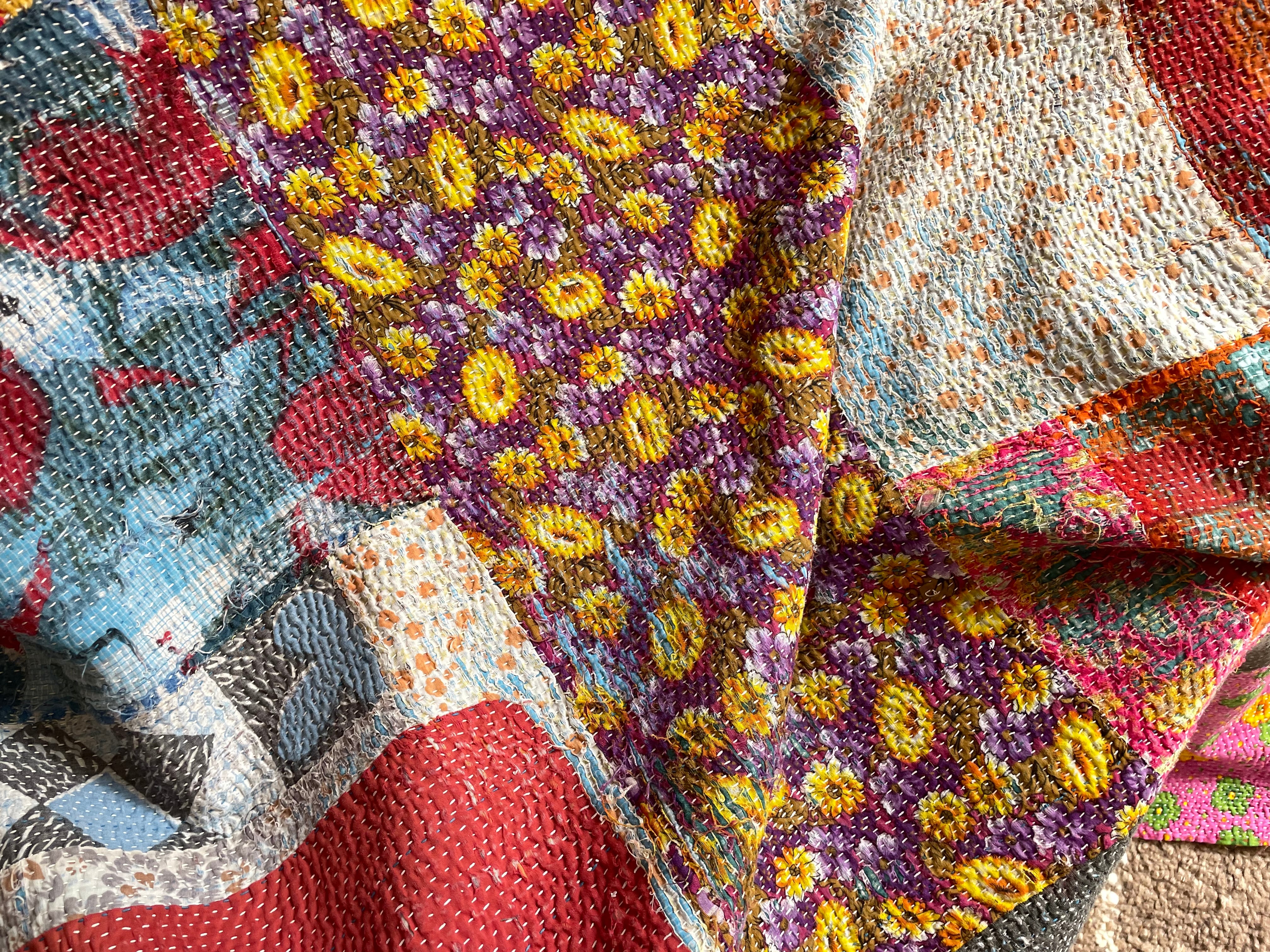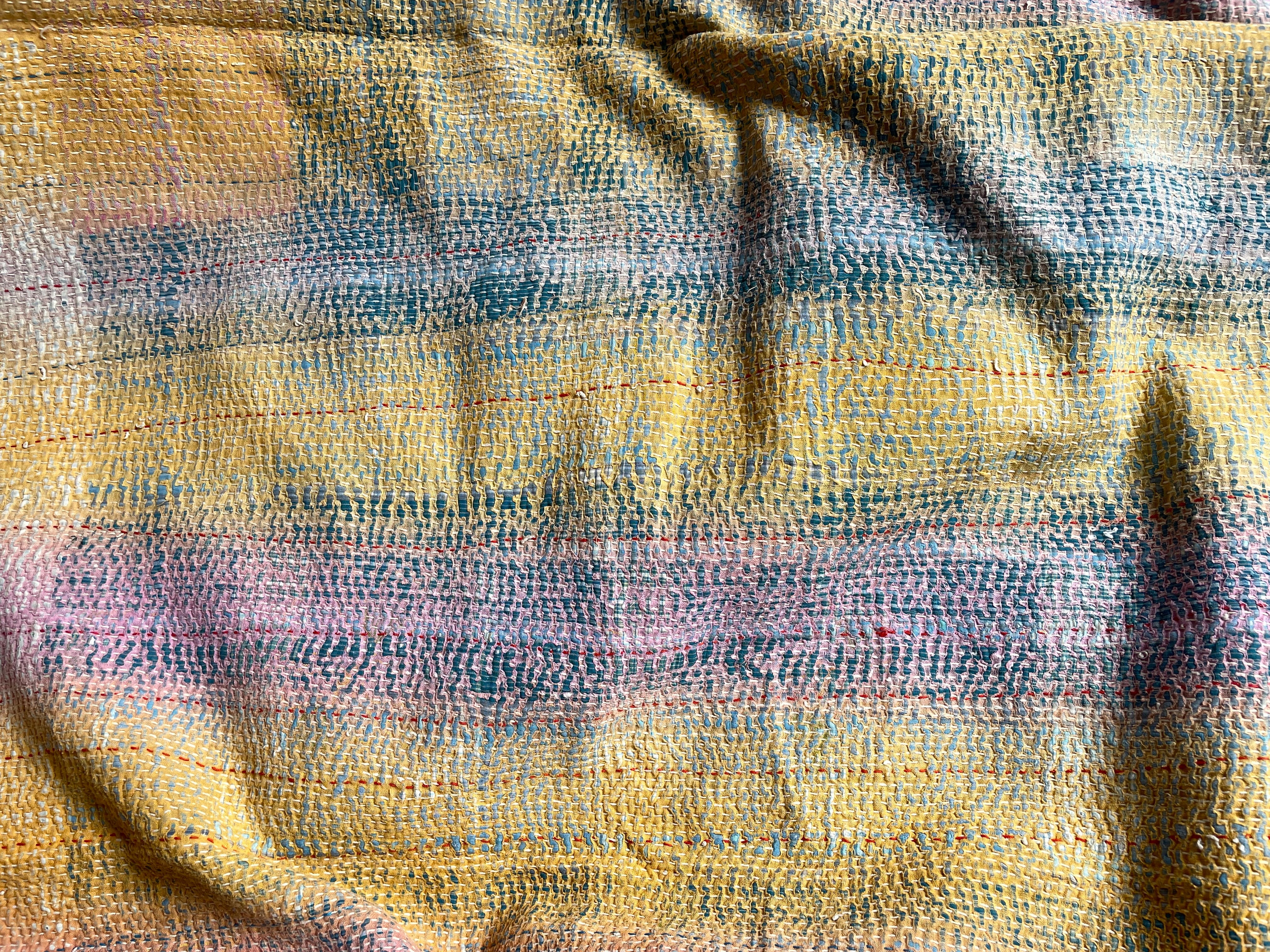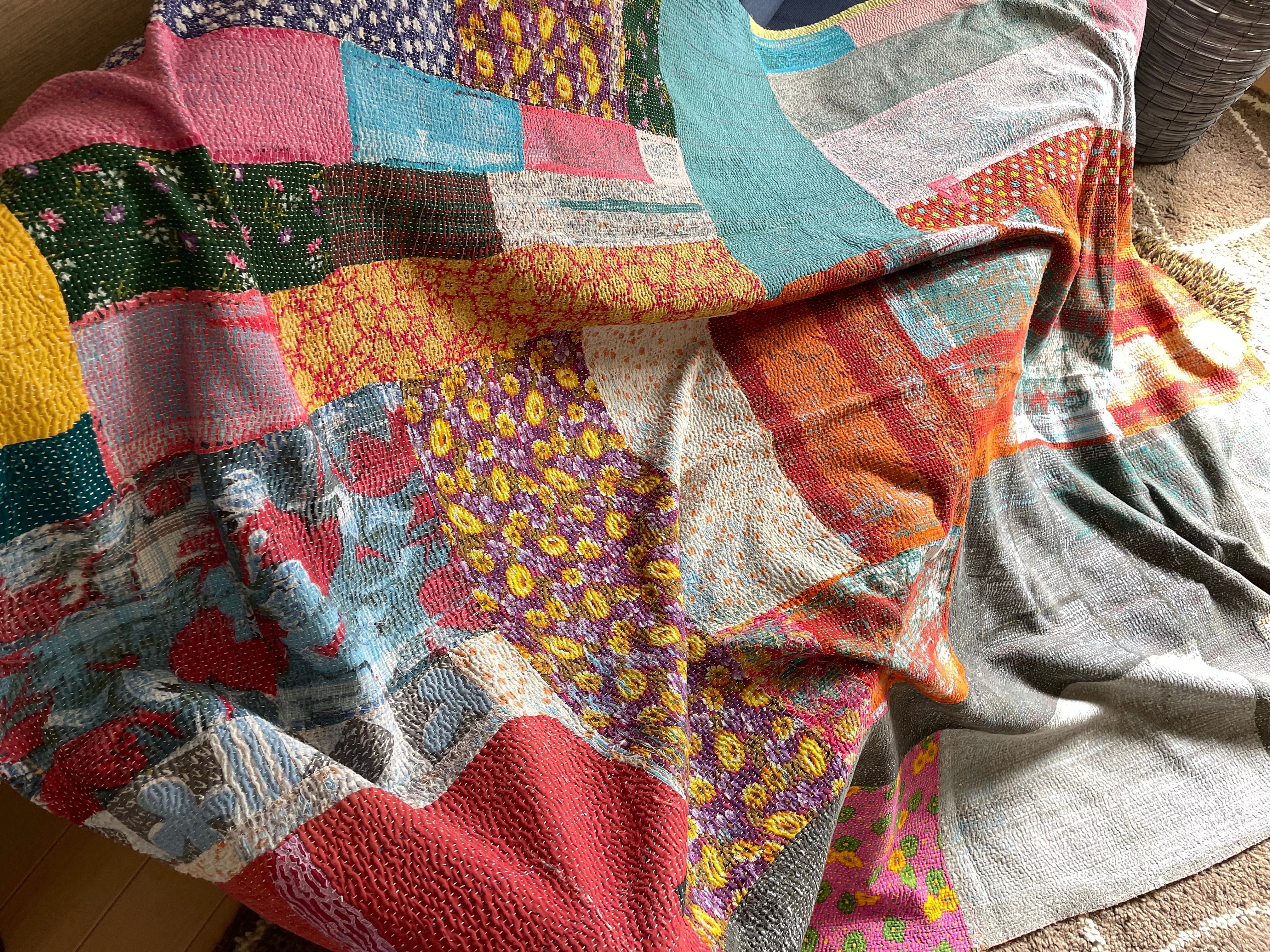 様々な色が混ざり合い、畳むと全て違う表情を見せるカンタ。ステッチや柔らかでクタッとしたコットンやビンテージサリーを細かくひと針ひと針、人の手によって刺し縫われ30〜50着をつないで作るビンテージカンタ。